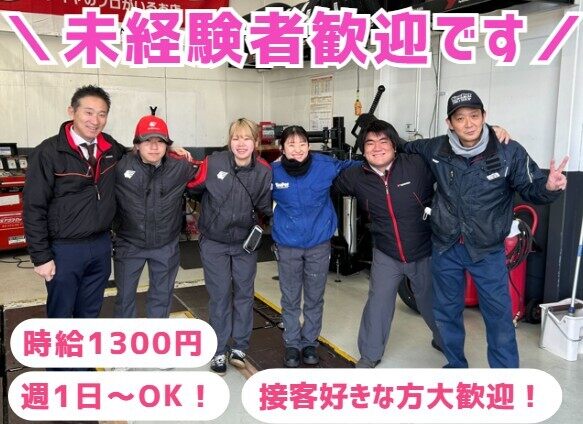 時給1,300円~▼免許無しの場合:時給1200円~ ▼土日祝時給50円UP ▼加給手当(ガンバリ報奨金アリ) →個人の実績(タイヤやオイルの 販売数など)によって、 毎月時給手当を加算する制度。 最大、時給+270円UP。 ※資格手当+残業手当+その他手当含む ※年齡・経験により考慮します ■各種手当あり ・昇給アリ ・賞与アリ ・資格手当アリ
