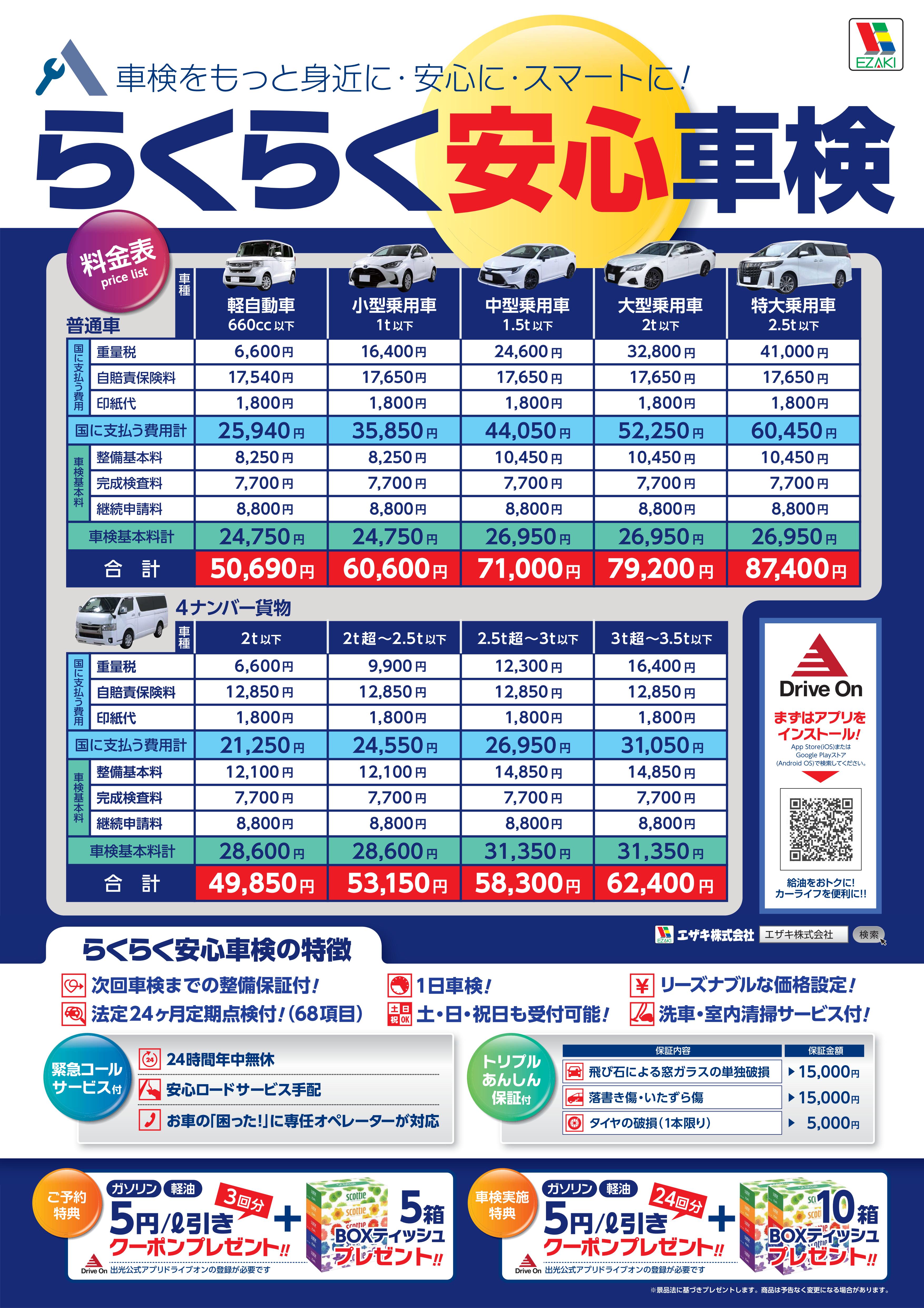 ※輸入車は別途5,500円、4WD車は別途3,300円、OBD検査対象車は別途3,300円が加算されます。