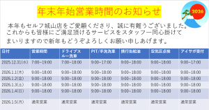 尾張旭セルフ城山店 【カーコンビニ倶楽部】【キーパープロショップ】【iPhone修理アイサポ】TEL/ 0561-55-3061 営業時間/ 7:00~23:00 2025.12.30(火) 年末年始営業時間のお知らせ SSからのお知らせ いつもご利用ありがとうございます!セルフ城山店です(^^) 本年もセルフ城山店をご愛顧くださり、誠に有難うございました。 これからも皆様にご満足頂けるサービスをスタッフ一同 心掛けてまいりますので新年もどうぞよろしくお願い申しあげます。 年末年始も休まず営業中です(^^♪ 営業時間が通常と異なります。 年末年始ご迷惑をお掛けしますが何卒よろしくお願い申し上げます。 前の記事を読む 一覧へ戻る