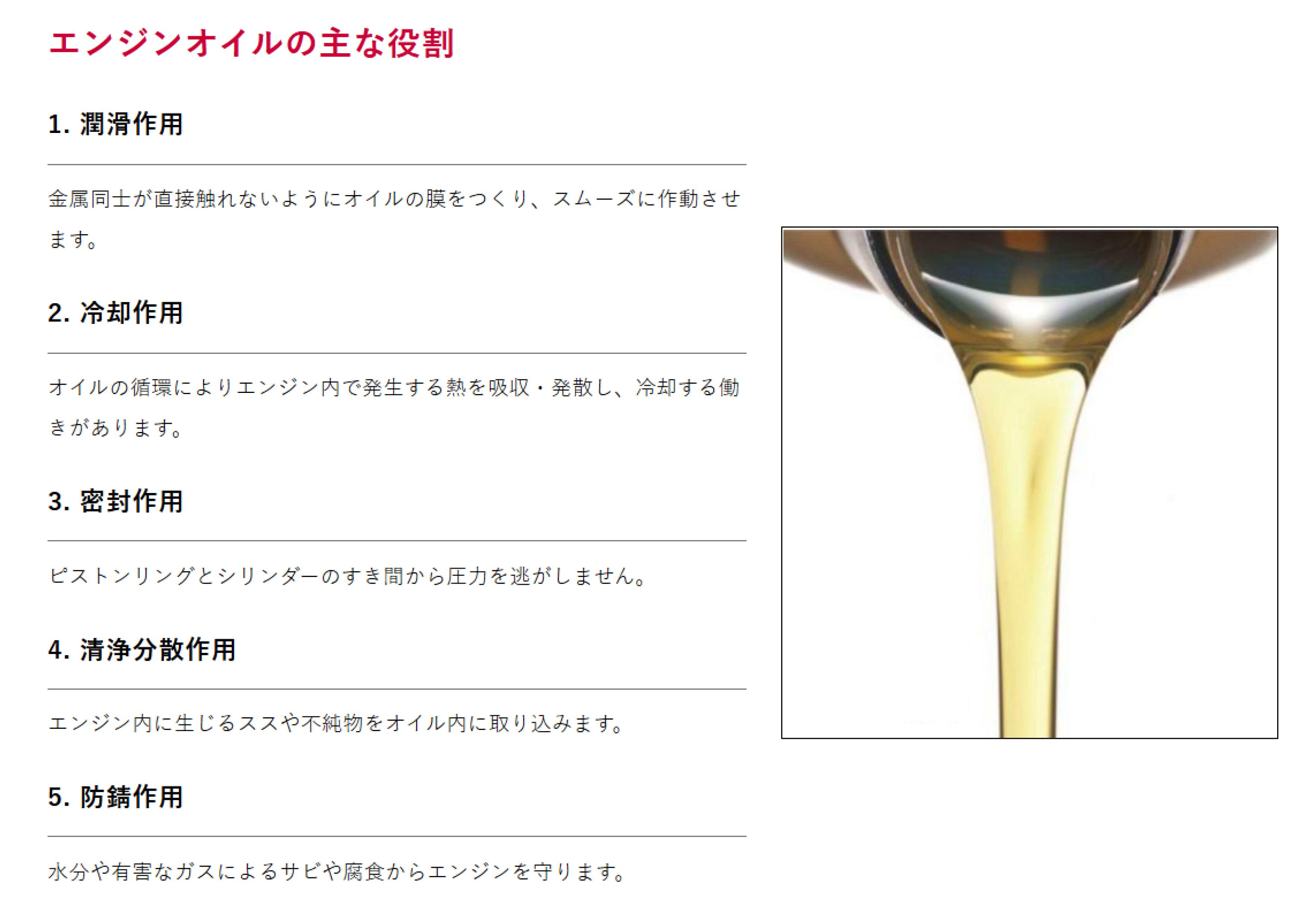 ・性能が失われたエンジンオイルでは本来の役目の潤滑がうまくできないことにより、異常摩耗や最悪の場合は焼き付きにつながります。