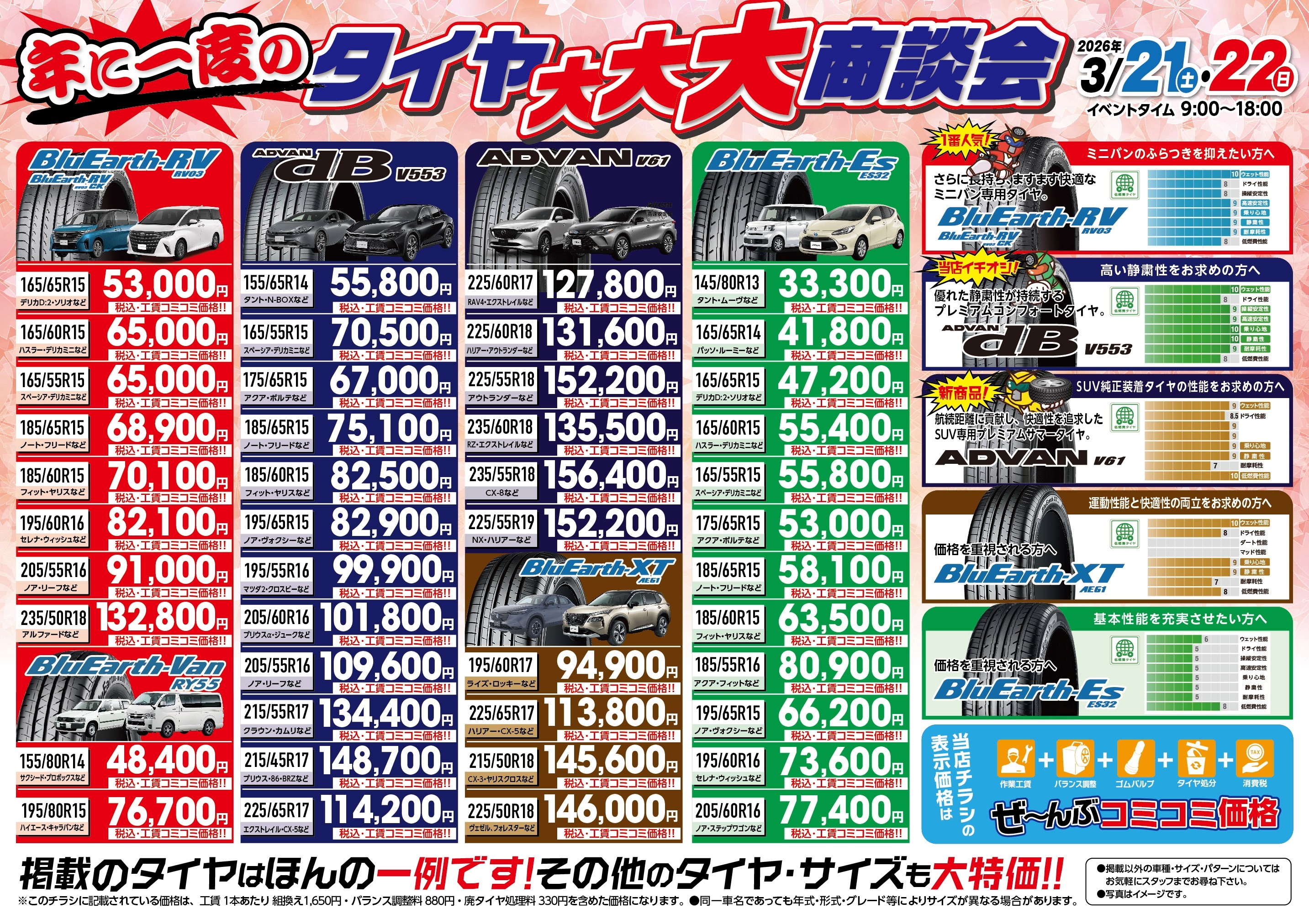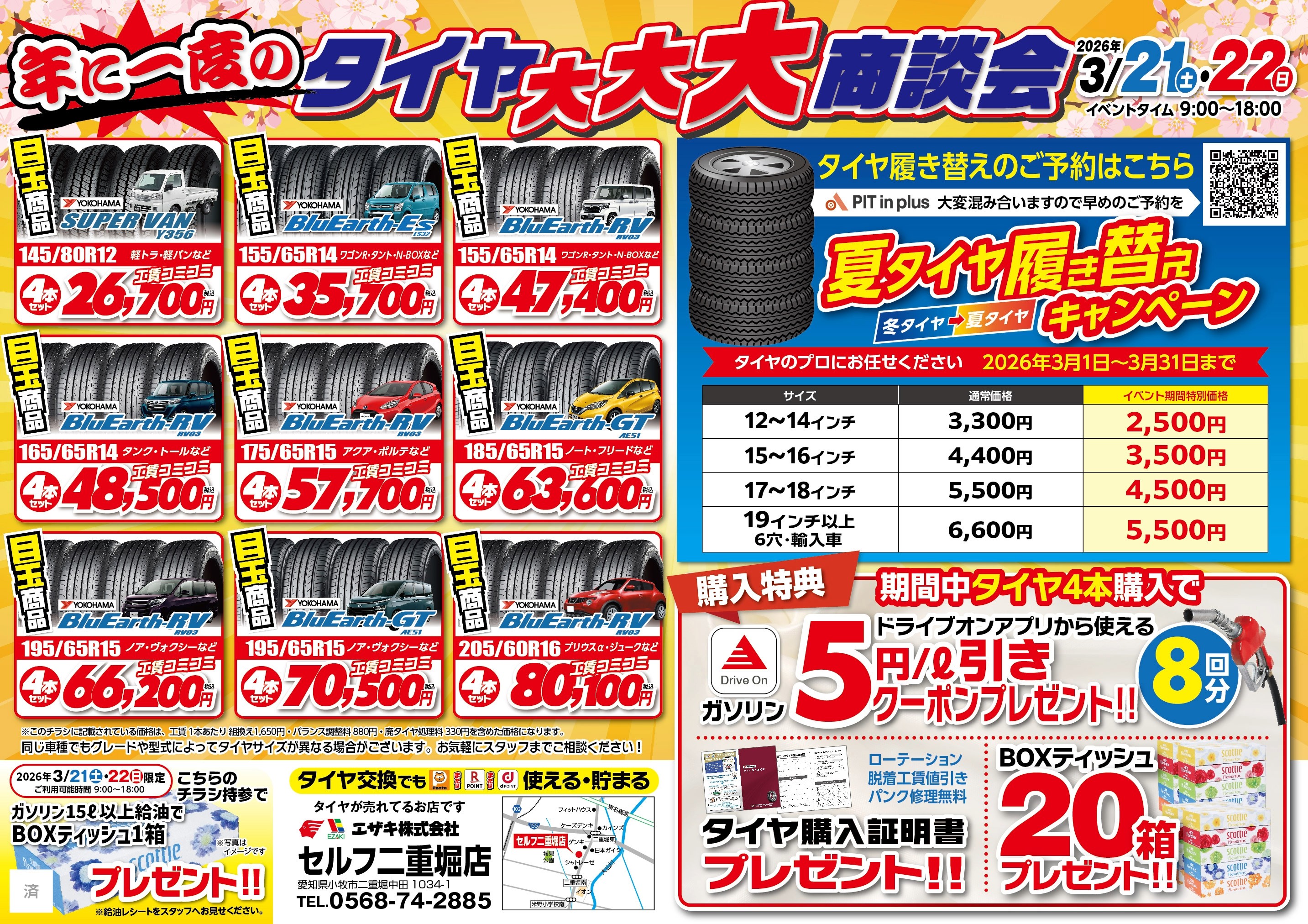 セルフ二重堀店TEL/ 0568-74-2885 営業時間/ 7:00~23:00 2026.03.02(月) 年に一度のタイヤ大大大商談会!!! キャンペーン情報 年に一度のタイヤ大大大商談会!!! 超絶本気の2日間!!! 2026年3月21日(土)、3月22日(日) タイヤご購入を検討されているお客様はこの2日間をお見逃しなく! 🌟タイヤが大特価! 🌟他店相見積もり大歓迎! 🌟タイヤ4本購入で5円/L引きのアプリクーポン8回分プレゼント! 🌟タイヤ4本購入でボックスティッシュ20箱プレゼント! 🌟タイヤ購入証明書付き! まずは本気の価格を見に来てください👊 イベント開催時間 両日9:00~18:00 前の記事を読む 一覧へ戻る