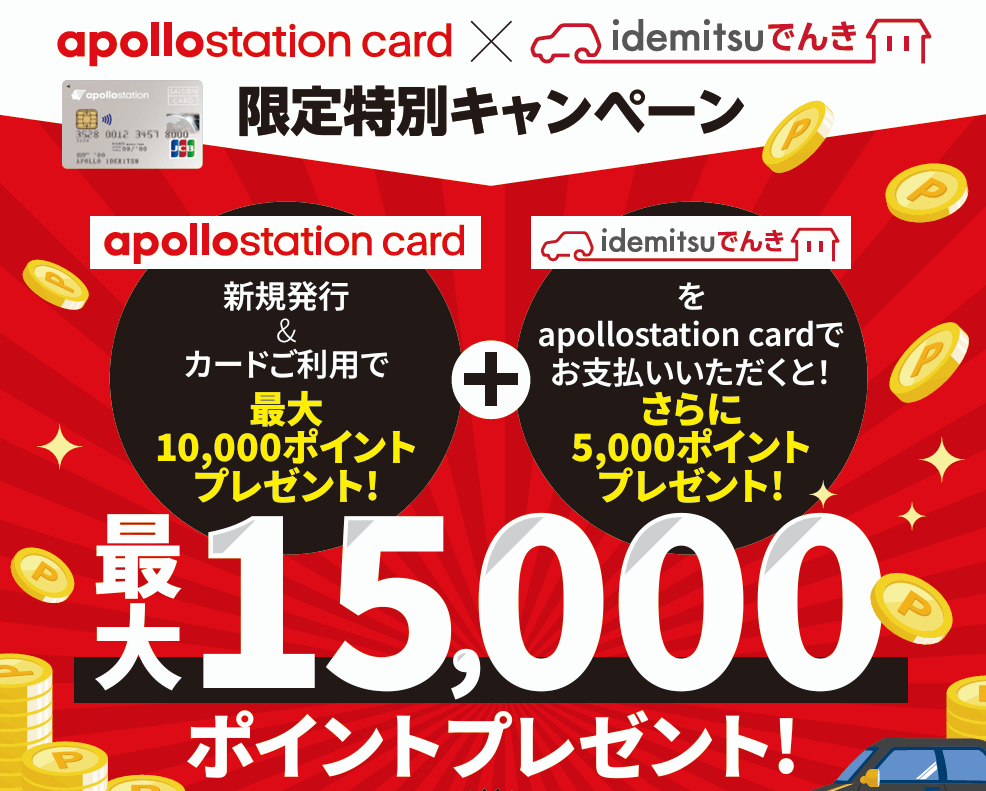 アポロステーションカード(apollostation card)を新規申込後のご利用とidemitsuでんき支払方法に登録すると最大15,000円相当のポイントがもらえる!