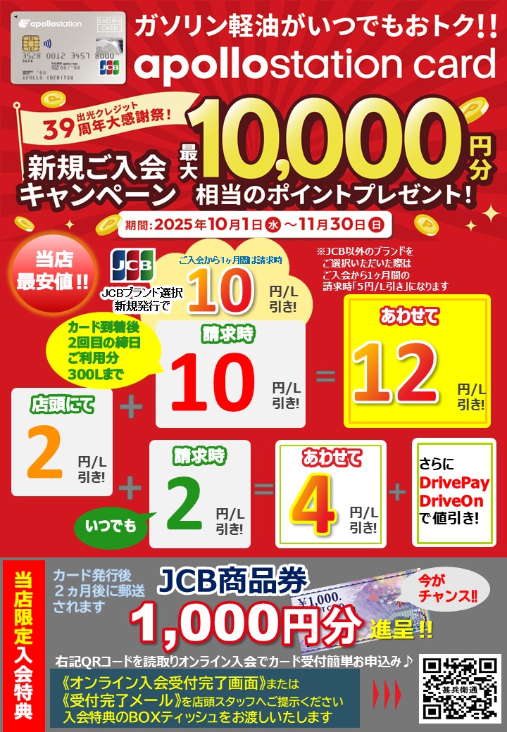 10/1~11/30の期間中に新規でapollostation cardをお申し込みいただいたお客様限定で